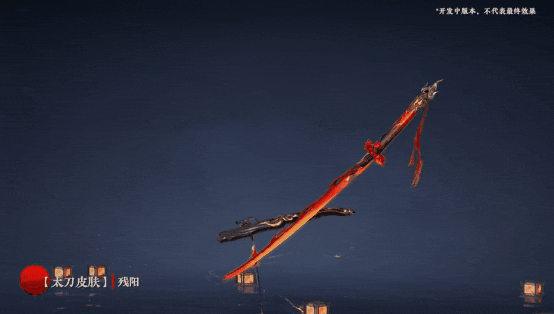 太刀的刀身呈現出火焰般的紅色,彷彿夕陽的餘暉。刀鞘上描摹着金色的複雜花紋,貴氣十足。