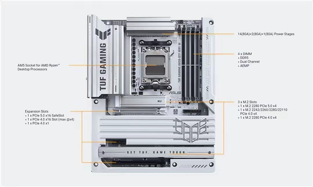 在硬件方面,TUF GAMING B850-BTF WIFI W主板同樣非常強大。它採用了14+2+1相供電設計,每個電流高達80A,足以支持高性能CPU的需求。內存方面,支持最高DDR5 8000+MT/s的超高頻率,滿足玩家對超頻性能的極致追求。主板還配備了三個M.2接口,其中一個支持PCIe 5.0標準,帶來了更高的傳輸速度。此外,Wi-Fi 7無線網口和2.5G有線網卡的加持,讓網絡連接更加穩定與快速,遊戲體驗不再受網絡波動影響。
