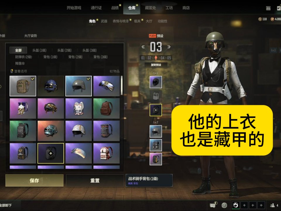 絕地求生裏,存在着幾種藏甲的服飾皮膚。所謂“藏甲”,並不是利用設置讓自己看不到防彈衣,而是不光自己看不見護甲,敵人也看不見你的護甲。換句話說,這纔是真正的“藏甲”——敵人無法判斷你的護甲等級或是否有護甲。