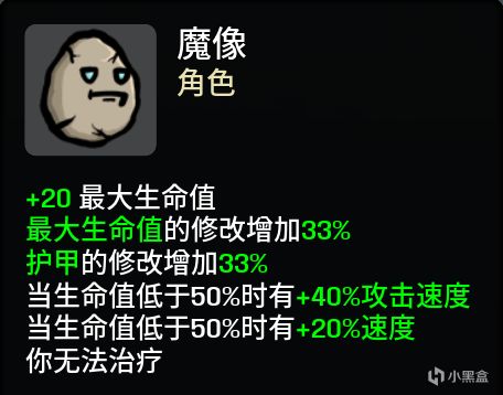 魔像是和大壯同類型的角色,都是增加生命值修改來提高辣醬的總體傷害。生命值修改+33%,等效辣醬總體傷害+33%