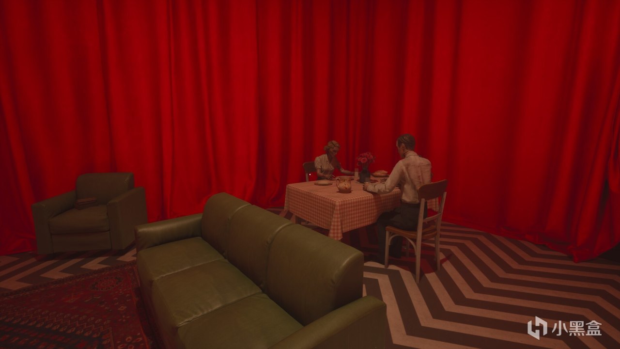 這個場景有着強烈的林奇式符號:紅色幕布、黑白鋸齒花紋地板,以及略顯詭異的傢俱佈置與人物形象。這與《Twin Peaks》中著名的“紅房間”非常相似。(製作組提及了深受1984和林奇的啓發)