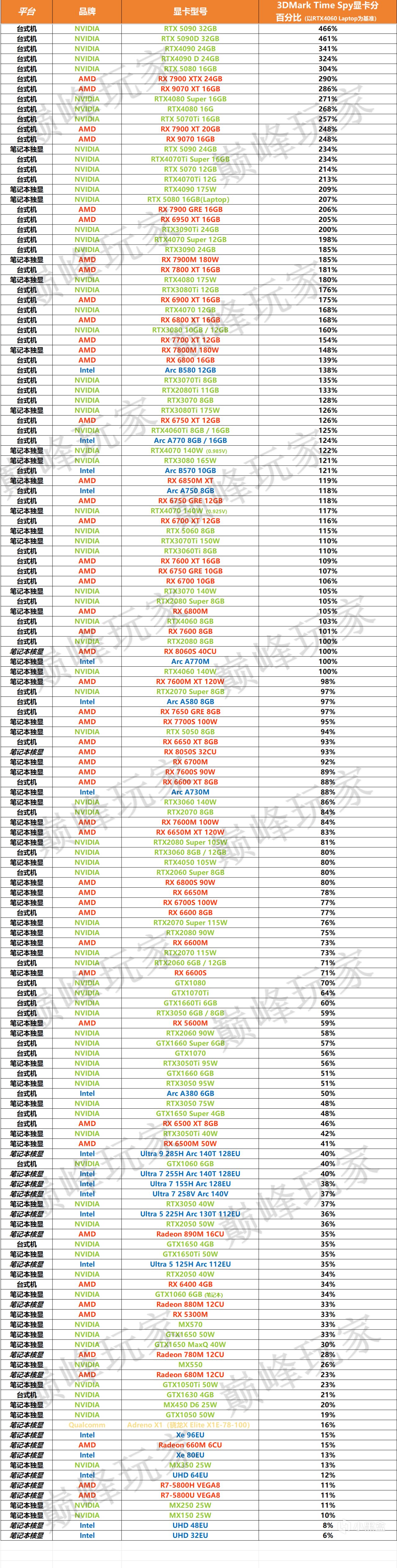 注意:顯卡分百分比數據建議僅做參考,跑分不能完全代表顯卡實際遊戲表現。