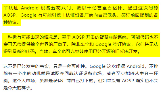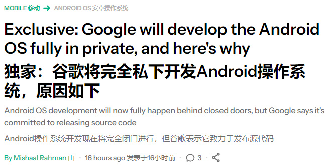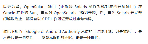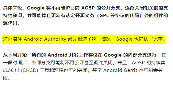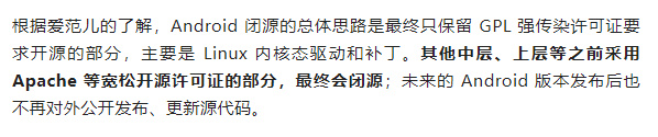 第二點則是,他們自稱拿到了絕對獨家內部的爆料, “ 谷歌的高層已經決定了,就是要徹底閉源安卓 ” 。