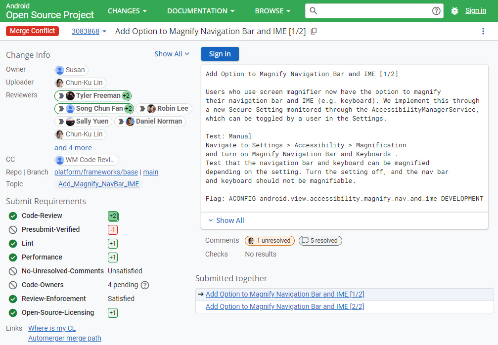 Android Authority 在報道中舉了個例子:有個亞馬遜的程序員給安卓系統提交了個補丁,允許系統裏的放大鏡工具放大導航欄以及輸入法的界面。