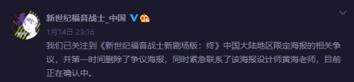 国内《新世纪福音战士》官方也发文称其我们已关注到《新世纪福音战士新剧场版:终》中国大陆地区限定海报的相关争议,并第一时间删除了争议海报,同时紧急联系了该海报设计师黄海老师,目前正在确认中。