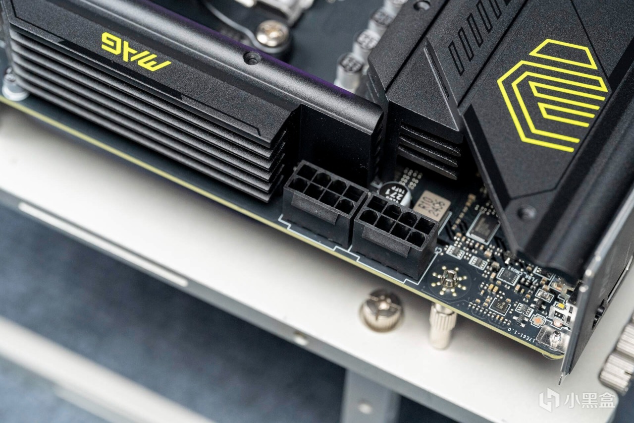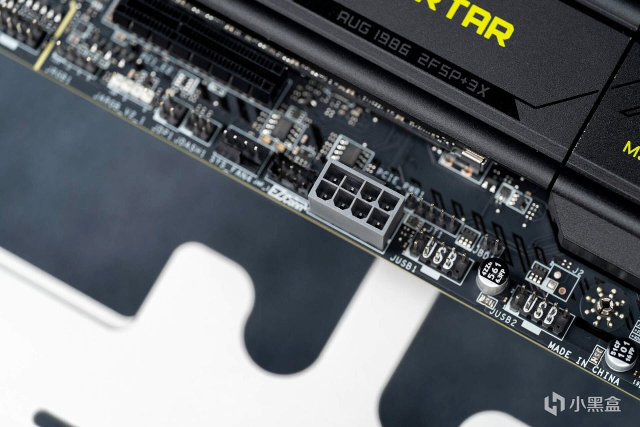 除了2個8pin的CPU供電插槽以外,靠近主板下方邊緣的位置還預留了一個8pin的PCIe供電插槽,隨着顯卡性能越來越強,功耗越來越高,微星提前佈局了更強的供電,以備不時之需。