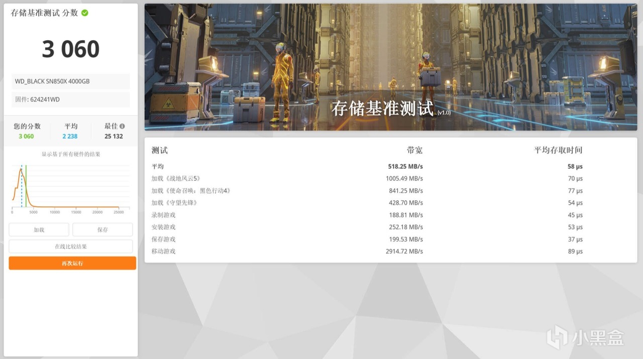 在3DMARK的存儲基準測試中WD_BLACK SN850X NVMe SSD得分約爲3060,超過了目前2238的平均成績,說明這款固態硬盤的性能還是非常優秀的。