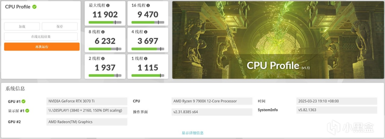 在3DMARK CPU Profile測試中7900X的1線程分數約爲1115,4線程分數約爲3697,16線程分數約爲9470,最大線程分數約爲11902.