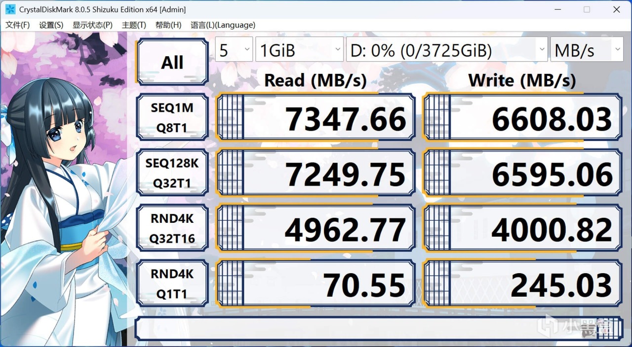 在CrystalDiskMark8.0.5中測得的Q8T1順序讀取速度約爲7347MB/s,順序寫入速度約爲6608MB/s。4k讀取和寫入速度分別約爲70MB/s和245MB/s。