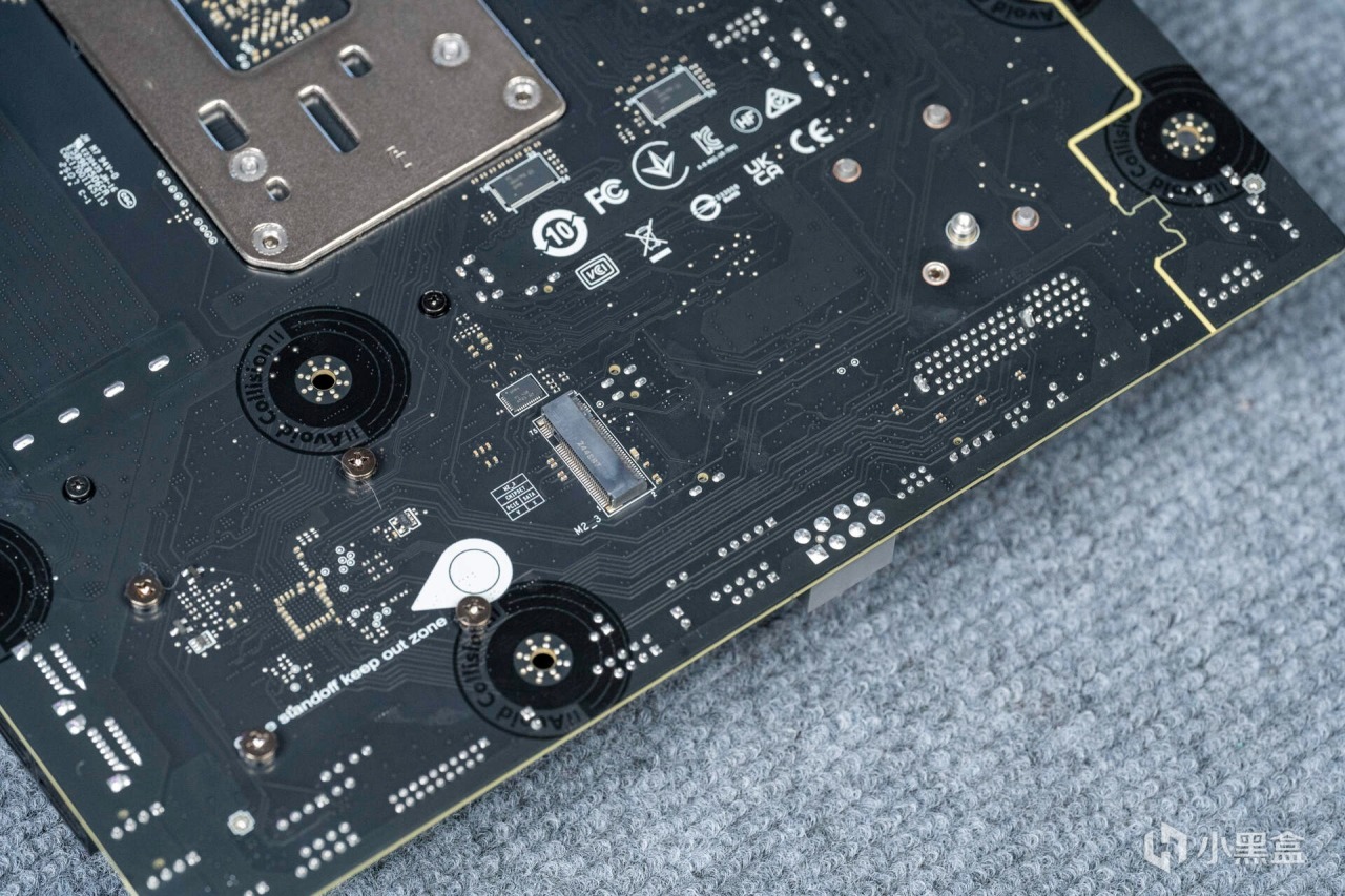 主板總計提供了3個M.2硬盤插槽。其中的2個分佈在主板正面,預裝了散熱裝甲。開頭的時候提到了這款主板的一些硬件配置連很多X870主板上都沒有,就是這兩個M.2插槽都支持PCIe 5.0×4規格,相比PCIe 4.0可以用到速度更快的固態硬盤。
