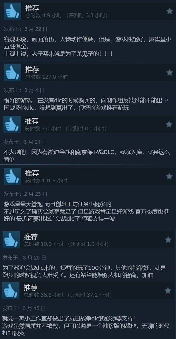 儘管存在操作生硬、畫質粗糙等問題,但DLC以30元低價提供的歷史沉浸體驗仍被多數玩家認可。尤其對於熱衷抗戰題材的玩家而言,遊戲中“用刺刀反衝鋒”、“炸藥包炸坦克”等細節,足以喚醒對歷史背景的情感共鳴。開發團隊表示,未來將優化操作手感並新增臺兒莊戰役地圖,或許能進一步彌補短板。