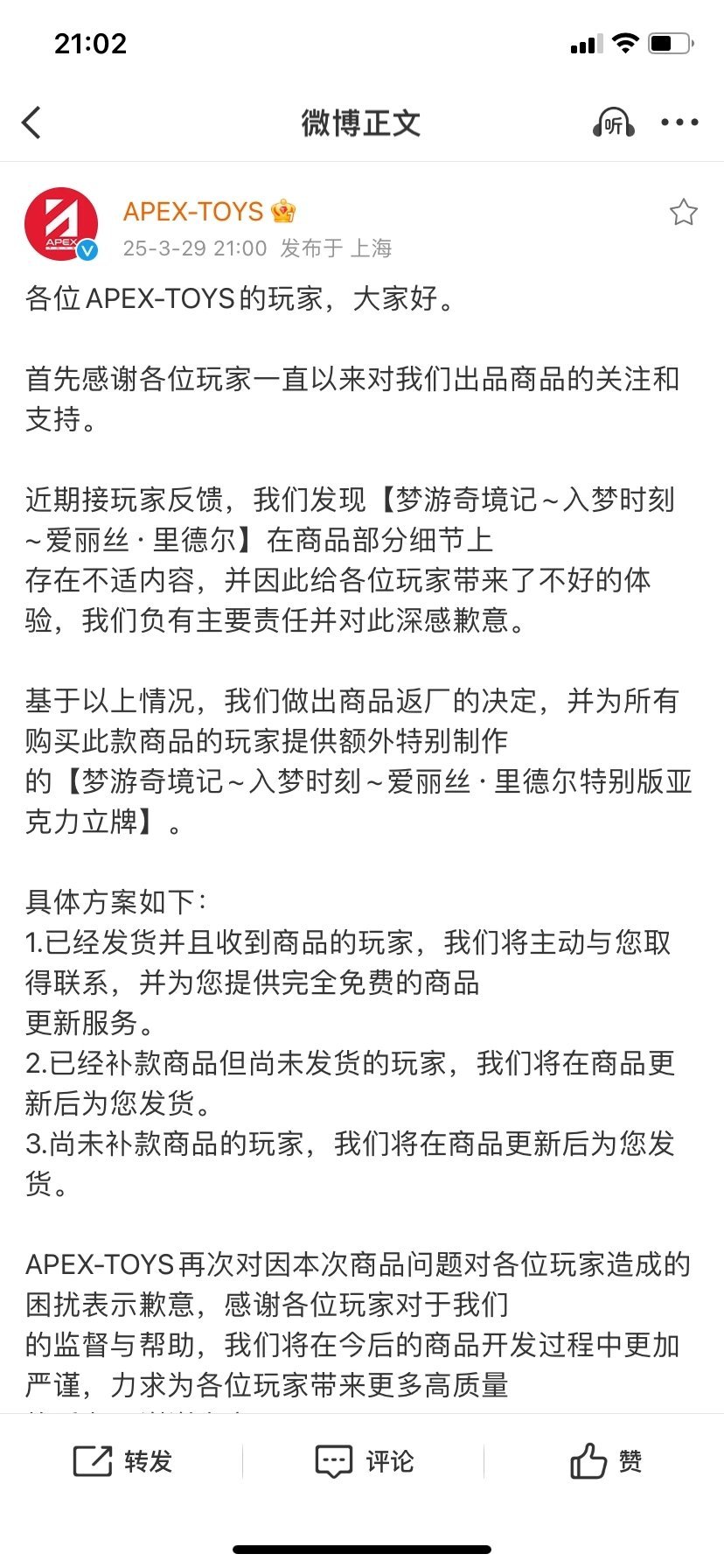 Apex官方也是在事件曝光後,也是迅速回應並下架該商品並承諾進行免費更新服務。