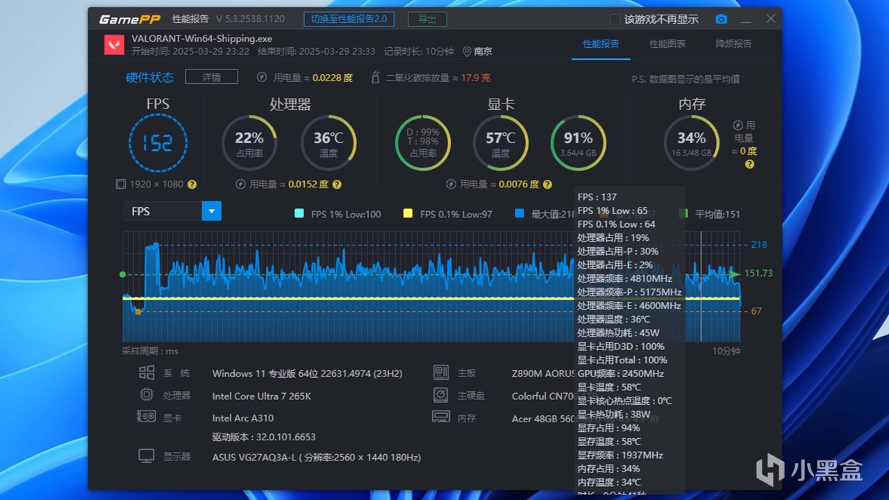看到這裏的朋友應該還想知道亮機卡到底能不能打遊戲,這裏順手測試了幾個,FPS網遊案例選擇無畏契約(DX11),畫質選擇1080P分辨率+全低,測試結果如下圖所示:
