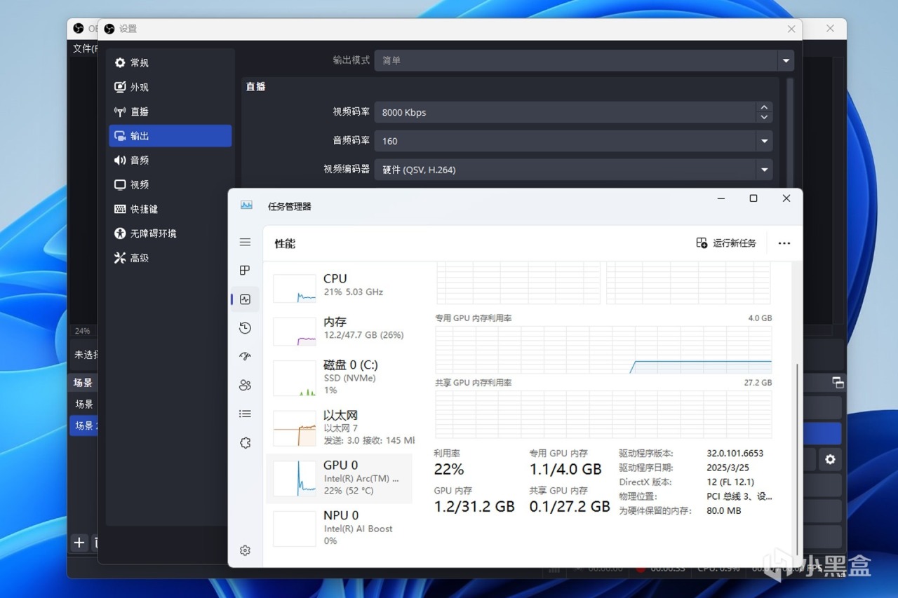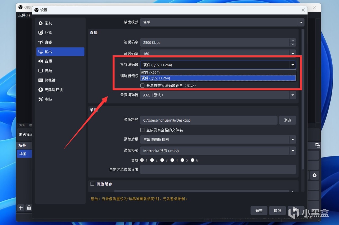 不同軟件的配置入口可能不同,但原理一樣的,這段舉幾個例子,首先是影音工具,一般在設置裏可以指定工作硬件,比如直播軟件OBS,設置成QSV HEVC即可改用顯卡編碼。