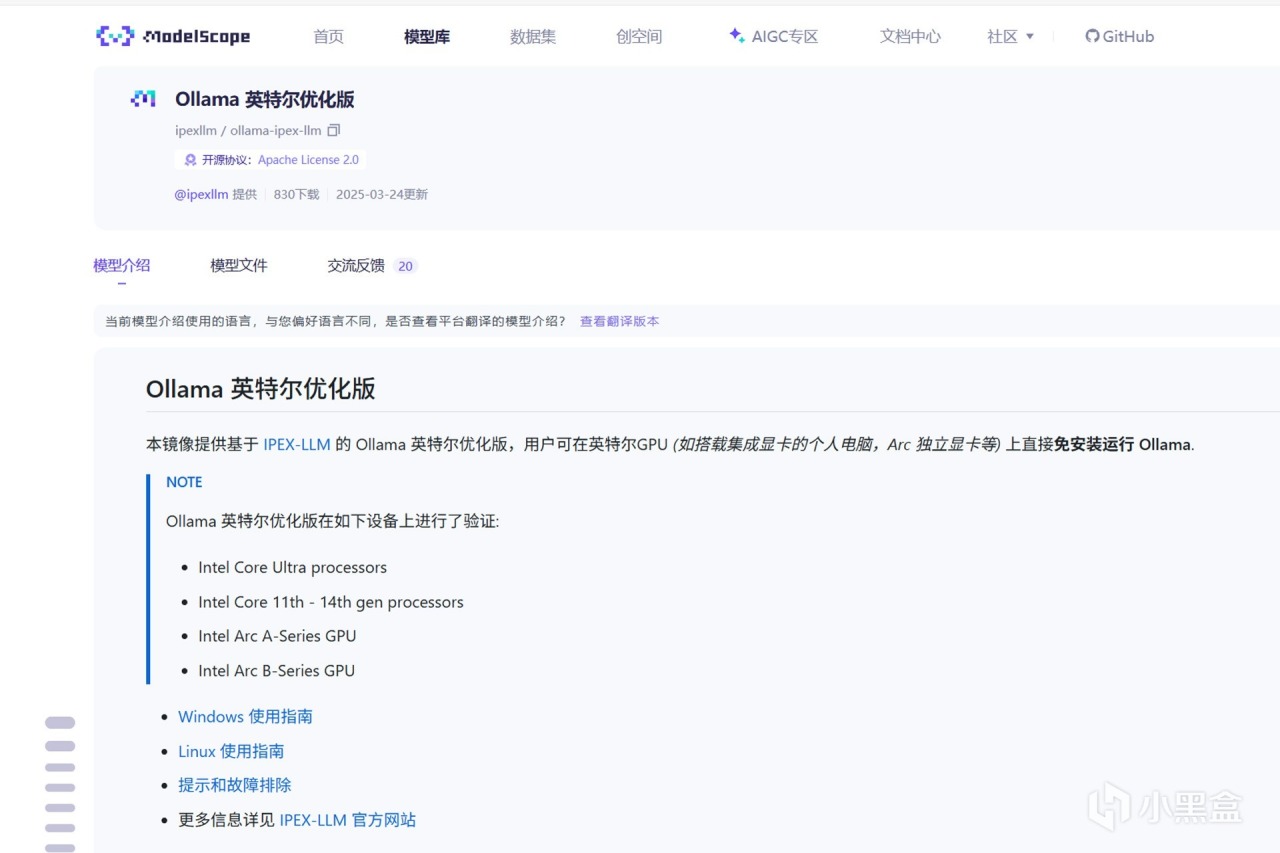其次是AI工具,需要在最初下載時就選擇適用當前顯卡的版本,比如Intel顯卡就有專用的IPEX-LLM版本的Ollama,使用官方版本無法調用顯卡,A卡同理。