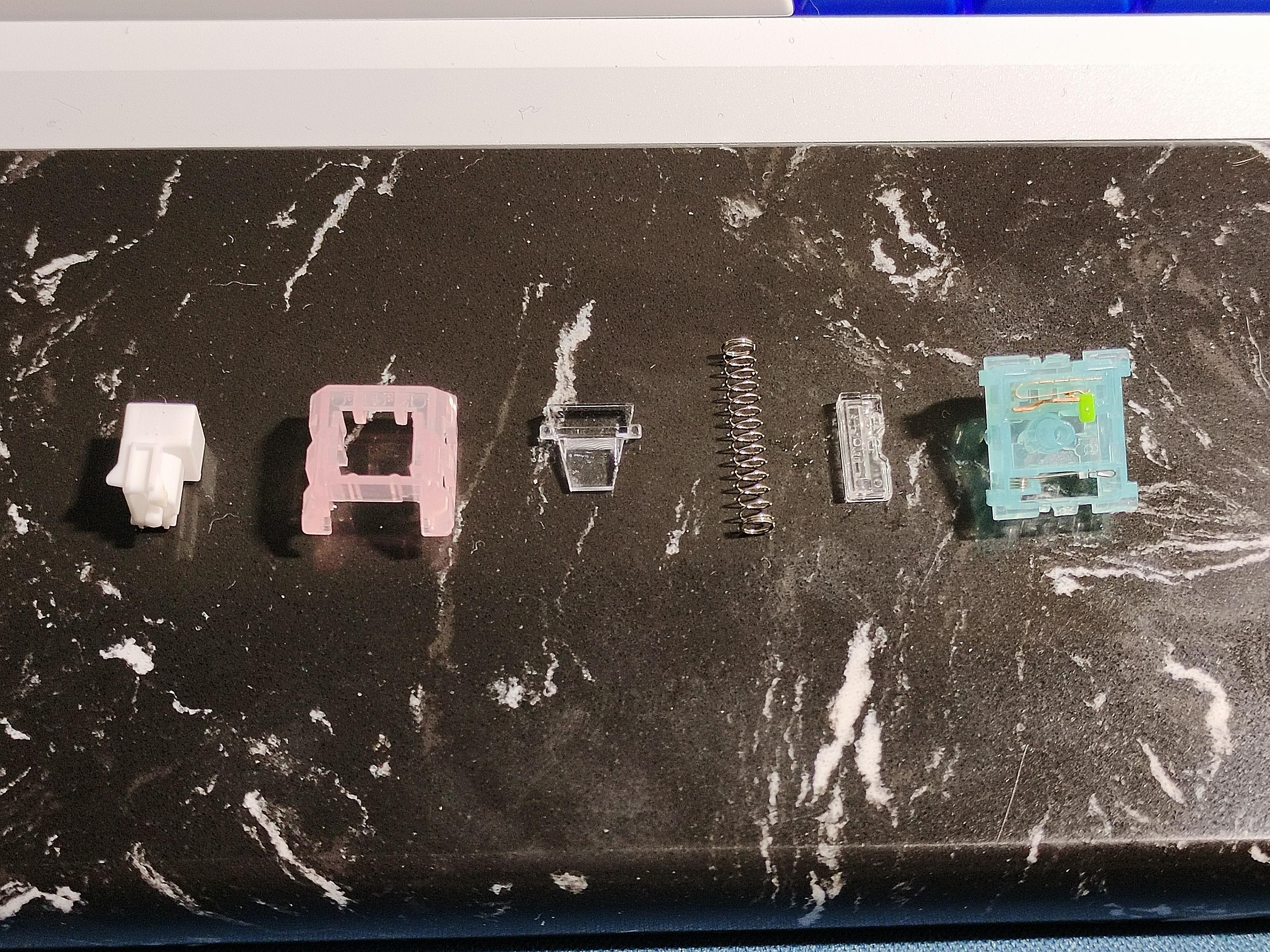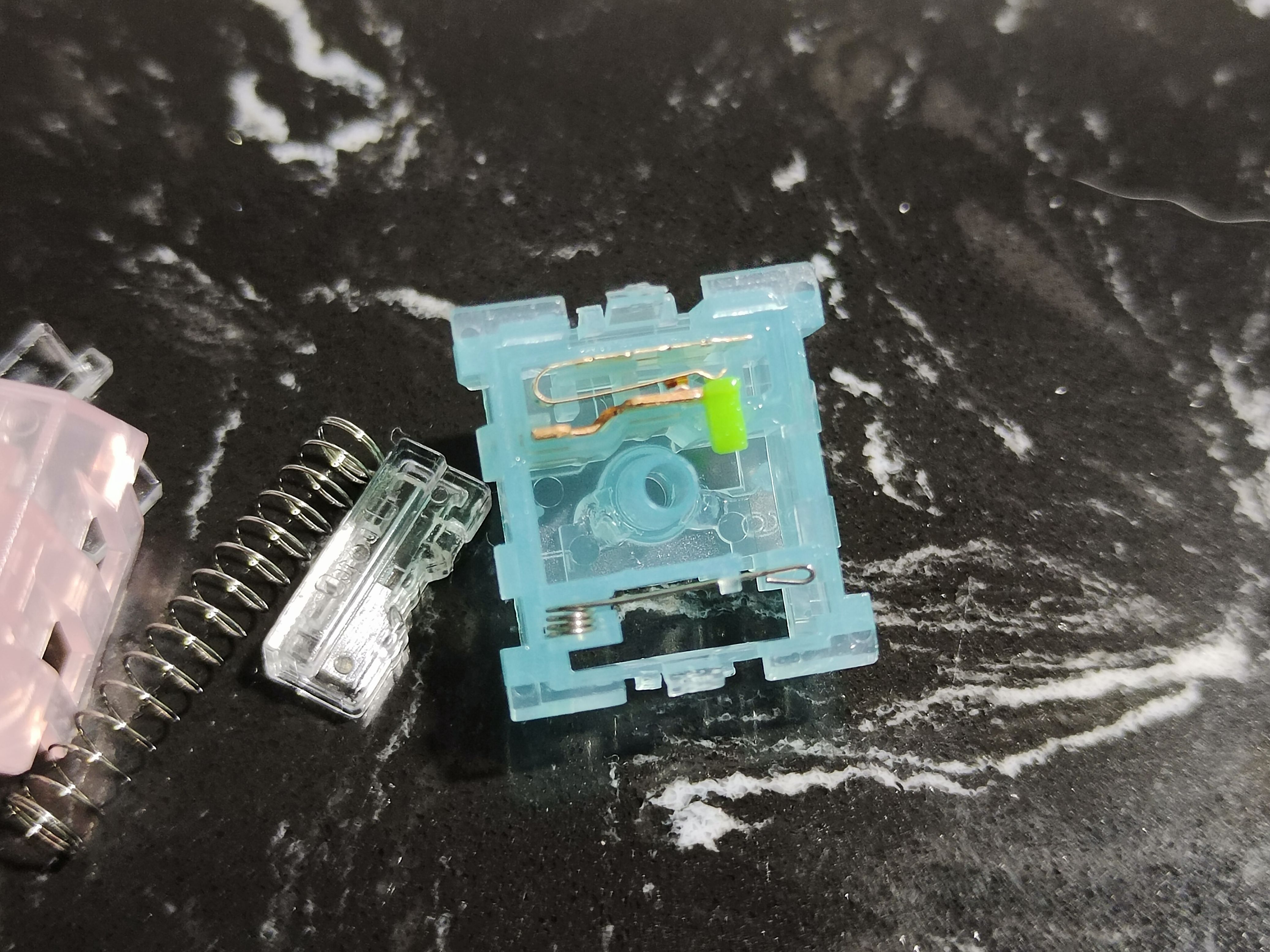 二角卡扣還是拿刀片撬軸體兩邊。正常人開軸器就好,這點是我瞎矯情,注意因爲本軸彈簧較長,注意不要一不留神開軸時候都給彈飛了。極地狐和半透棉花糖模具一樣,但是我覺得棉花糖好看不少,只可惜目前二手市場很少能找到了