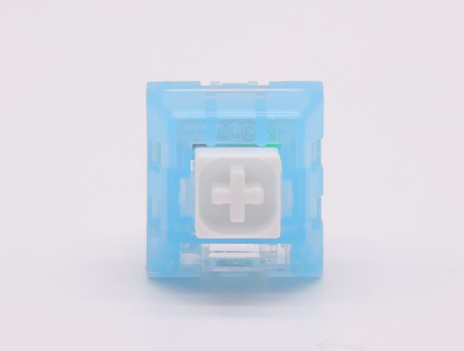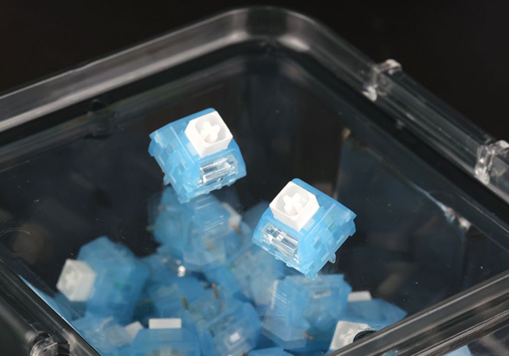 外觀方面,極地狐還是蠻漂亮的。淡藍色透明PC外殼,白色pom軸心,透明外殼甚至可以看到內部box結構的綠色彈片,box結構不同櫻桃mx結構,內部結構更復雜,因此軸體相對來說更加耐用並且防塵放水性能好,深受廣大玩家的好評。而凱華box軸的段落不同傳統青軸發聲結構,手感上更加清脆舒適,因此基本上成爲了段落玩家的首選。