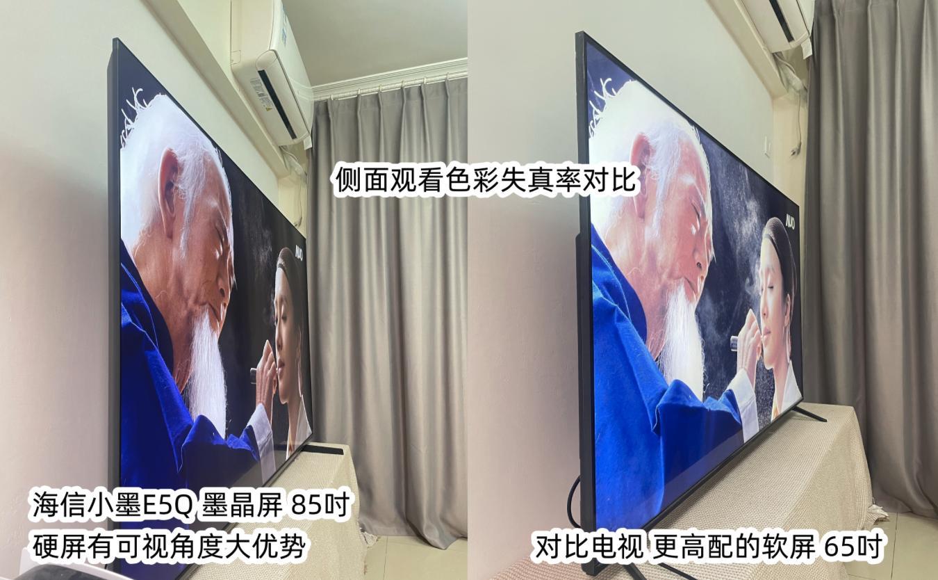 解決了常規屏幕反光、泛白的問題,我們基本就可以“躺平”享受生活了,但海信通過墨晶屏順便解決了側面看電視畫面效果大打折扣的問題,廣視角178°側看光色不變,坐在電視兩側和電視正前方的效果一模一樣。