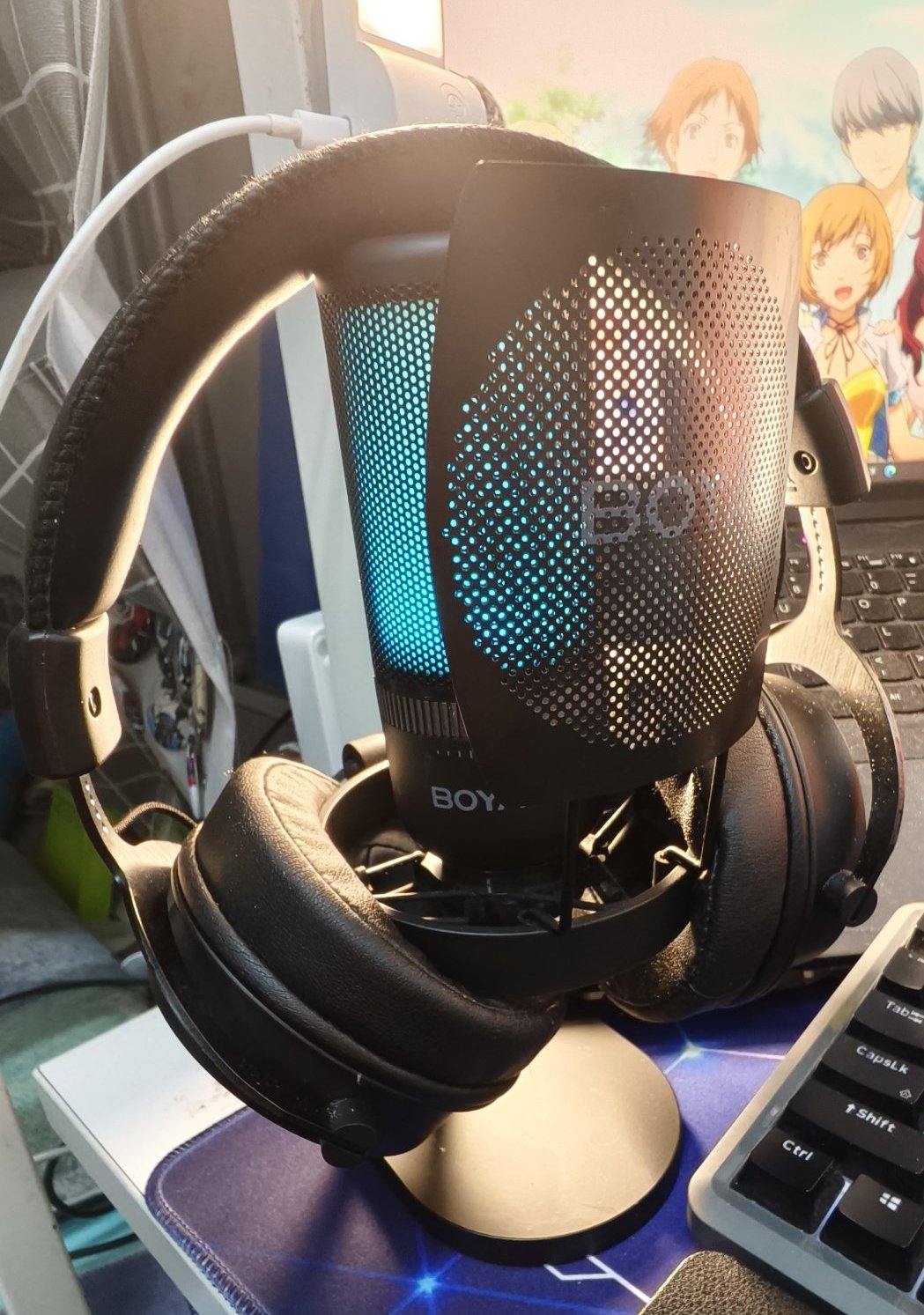配合耳機買的,自帶聲卡,插入耳機能聽到自己說話的聲音。降噪效果一般,舍友唱歌聲音也能錄上。而且麥很粗,無法正常插入其他的能買到的耳機支架。綜合來看,與其買監聽+麥克風,真不如買個遊戲耳機方便舒適。