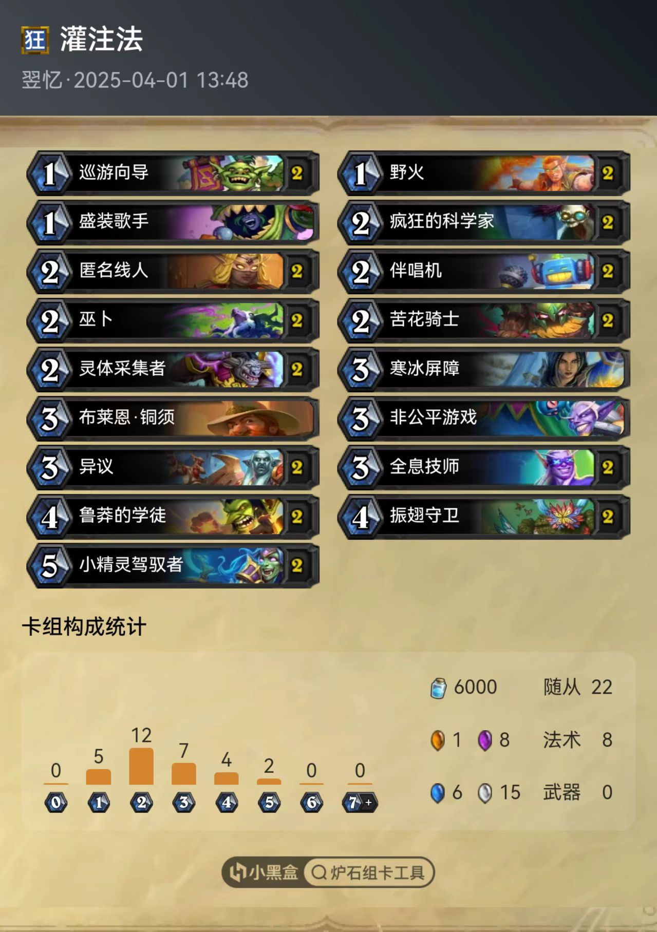 ### 灌注法 # 职业:法师 # 模式:狂野模式 # # 2x (1) 巡游向导 # 2x (1) 野火 # 1x (1) 盛装歌手 # 2x (2) 疯狂的科学家 # 2x (2) 匿名线人 # 2x (2) 伴唱机 # 2x (2) 巫卜 # 2x (2) 苦花骑士 # 2x (2) 灵体采集者 # 1x (3) 寒冰屏障 # 1x (3) 布莱恩·铜须 # 1x (3) 非公平游戏 # 2x (3) 异议 # 2x (3) 全息技师 # 2x (4) 鲁莽的学徒 # 2x (4) 振翅守卫 # 2x (5) 小精灵驾驭者 # AAEBAf0EBMABhReR4QPo6AUN9w2bzQPT7APW7AP+7AS87QSvxAWiswbW+gbc+gb0/Ab3gQfujQcAAA== # 想要使用这副套牌,请先复制到剪贴板,然后在游戏中点击“新套牌”进行粘贴。 # 分享自小黑盒炉石传说卡组推荐工具