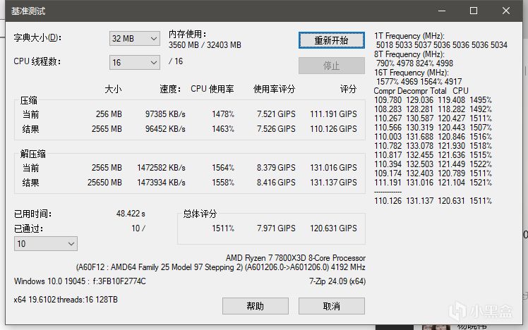 默頻測試:壓縮得分110GIPS,解壓縮得分131GIPS,總得分120GIPS。