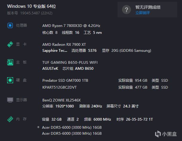 本次測試的平臺爲Windows 10專業版64位,配置爲7800x3d+華碩B650TUF+7900XT
