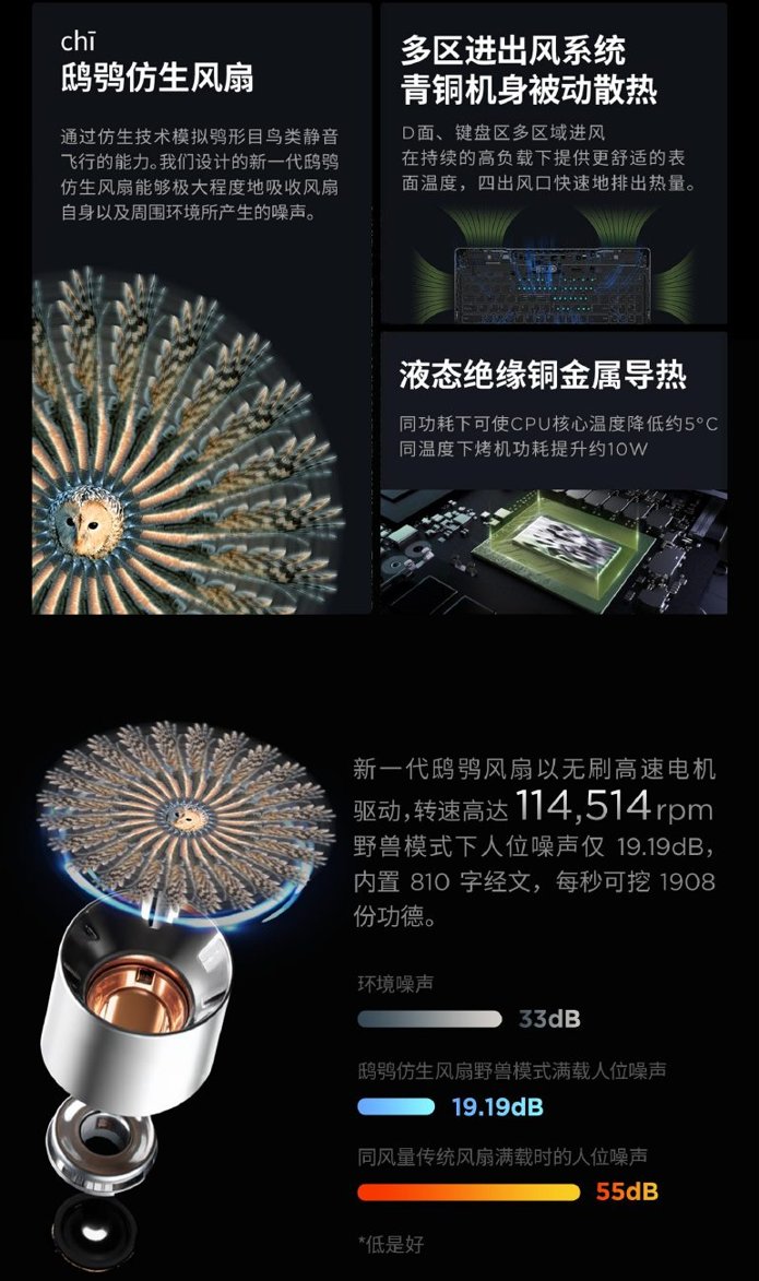 仿生風扇模擬鴟鴞靜音飛行的能力,新一代鴟鴞風扇以無刷高速電機驅動,轉速高達 114,514rpm