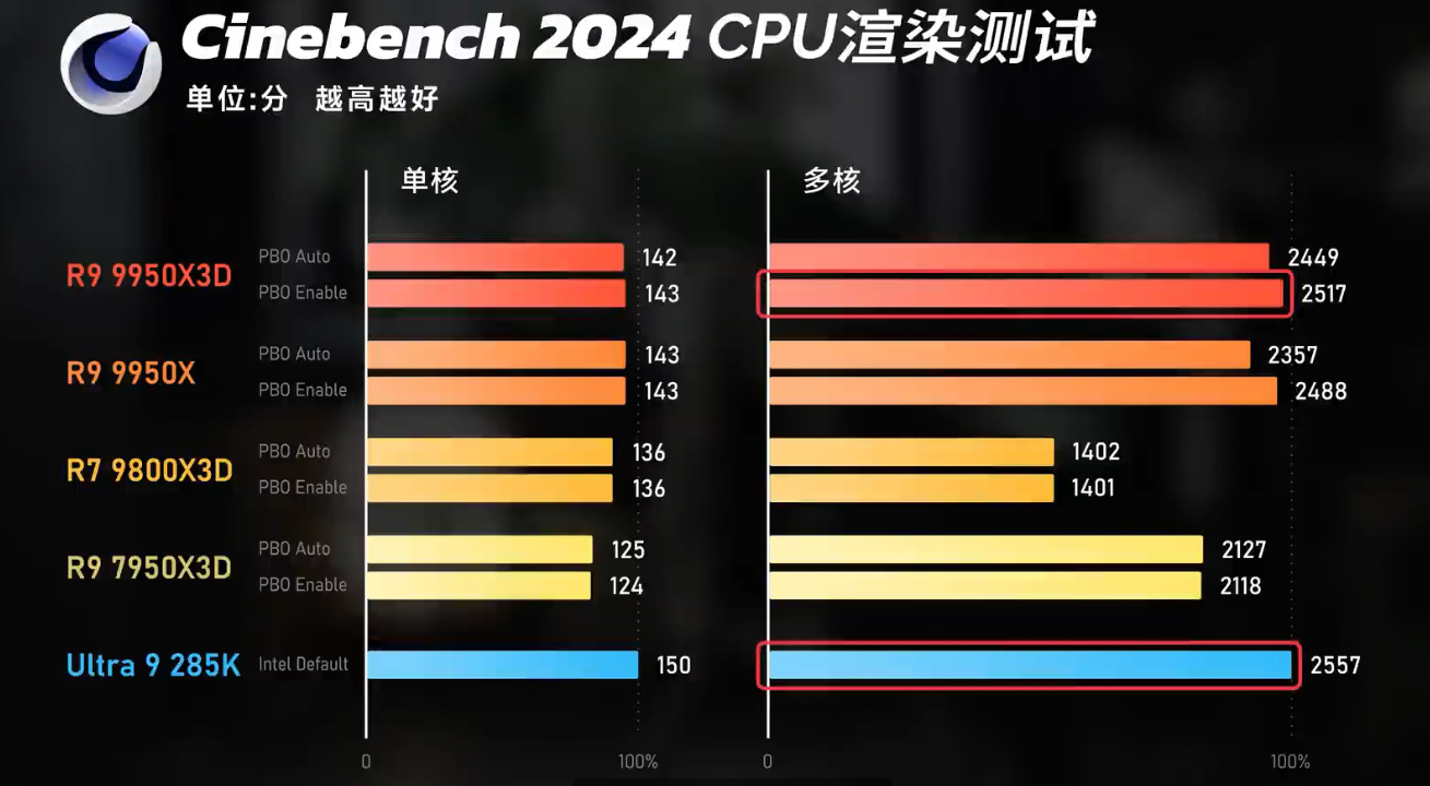cinebench r24测试能很好反映CPU的多核(生产力性能)表现,目前英特尔U9 285K和AMD R9 9950X3D两颗旗舰U对比如下: