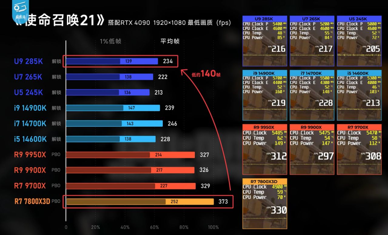 那英特尔的旗舰CPU U9 285K表现怎么样呢?很不幸的不咋地,4千多价格,游戏性能却和AMD 2千多的R7 9700X差不多;甚至个别游戏的平均帧,才赶上2500元R7 7800X3D的最低帧: