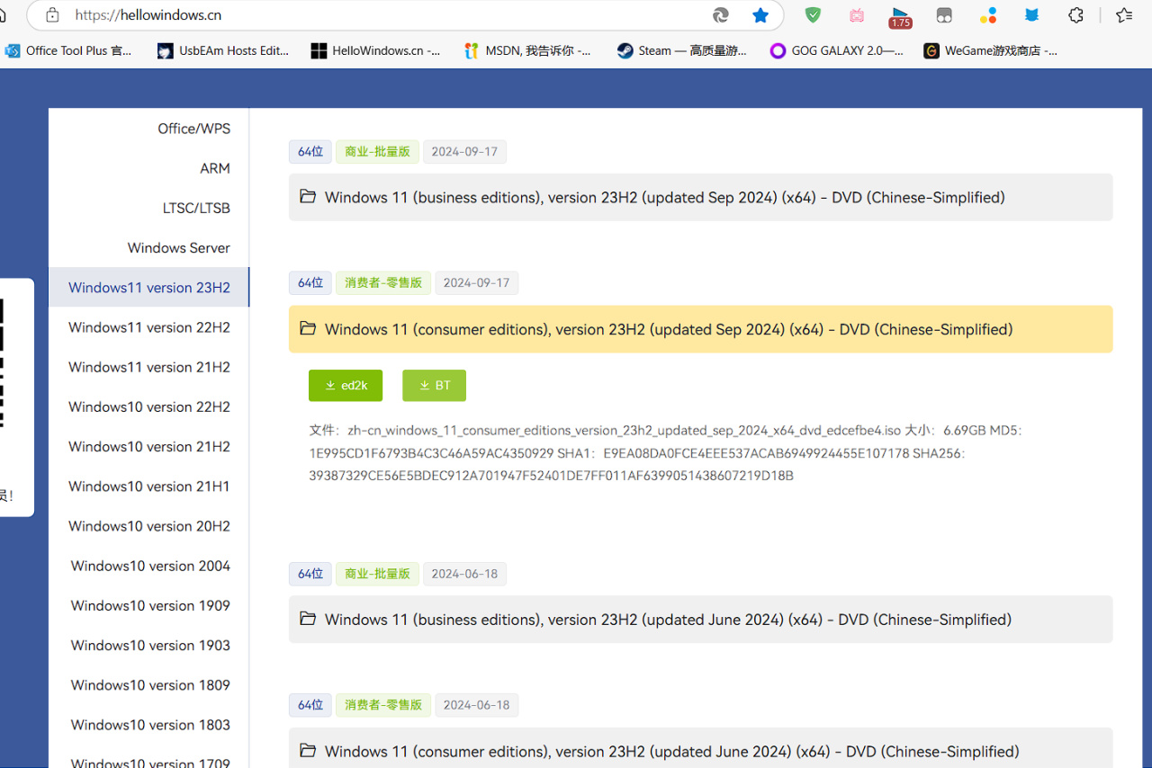 4.下載iso系統文件,可以在I Tell you/hellowindows/微軟官網下載純淨版WINDOWS系統,顯示爲BT/ed2k下載的要用迅雷等磁力鏈接下載工具進行下載(圖片最上方也有官網地址)。下載之後保存的位置儘量不要在C盤。