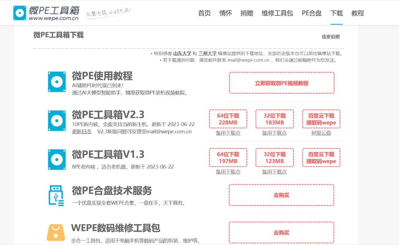 2.找到微PE官網下載微PE(官網:https://www.wepe.com.cn,下方圖片最上方也有官網地址),點擊“下載”,找到“查看2.3版本下載地址”並點擊,有想法的可以捐贈一下,表示支持,沒想法的就直接點擊“先不捐贈”來獲得V2.3和V1.3版本下載地址。