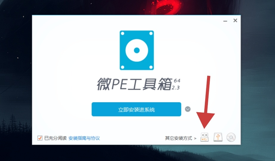 4.點擊微PE工具箱主頁右下的U盤符號,進入到“安裝PE到U盤”頁面