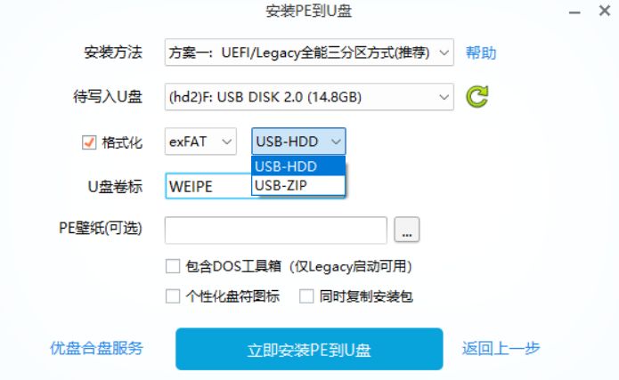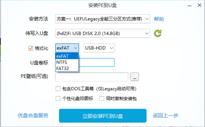 3.格式化勾選(U盤有重要信息先備份),選擇exFAT和USB-HDD。安裝方法選擇第一個。可以自定義U盤卷標和PE壁紙。點擊“立即安裝PE到U盤”。然後等待,在等待過程中不能拔出U盤