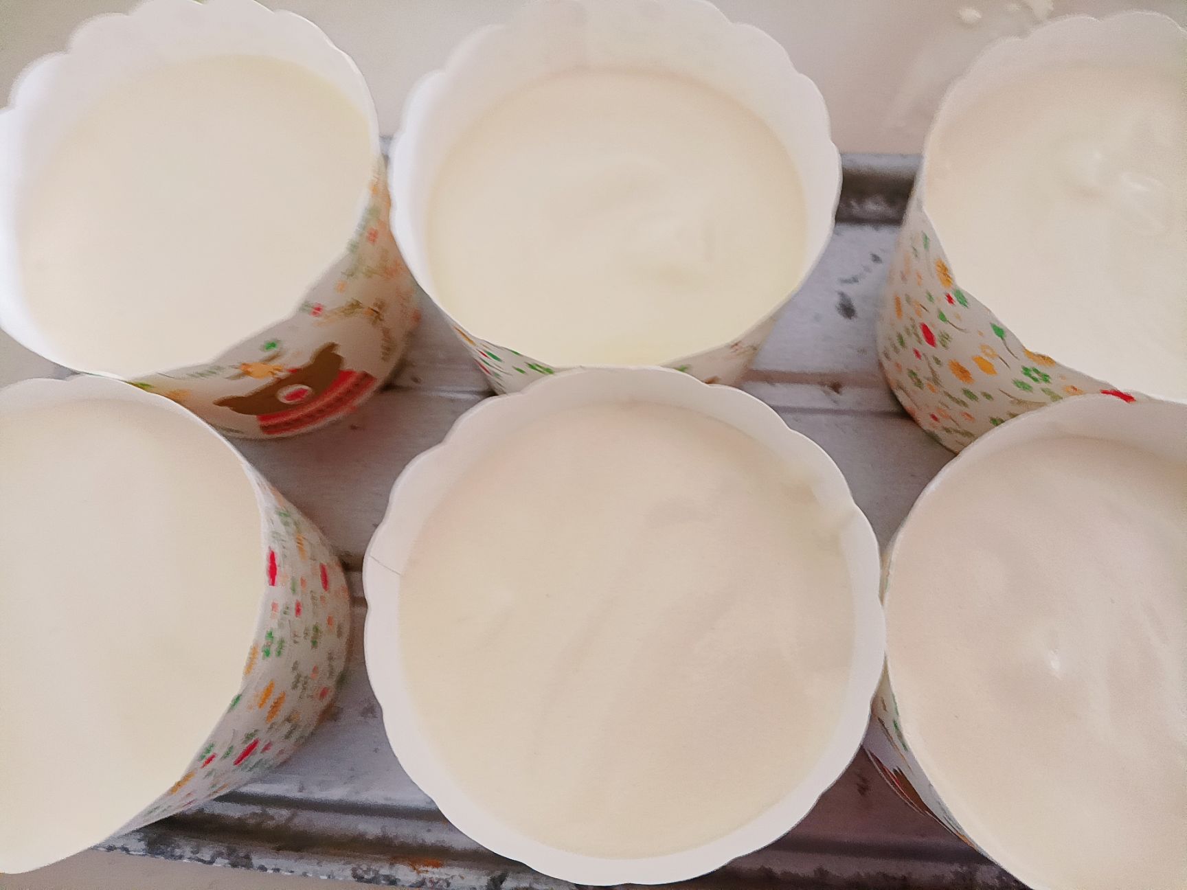 将1/3打发的鸡蛋清加入面糊中进行翻拌,翻拌均匀后倒入到剩下的蛋清中。翻拌完倒入纸杯中,八分满。