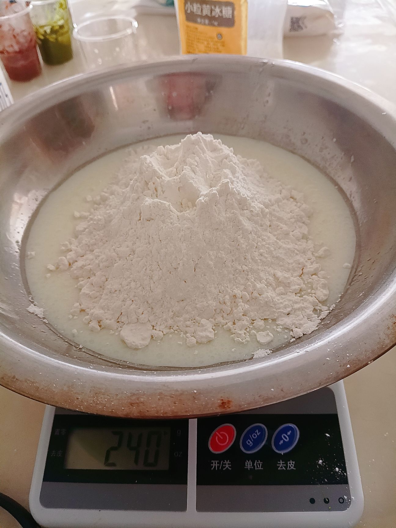 将240克低筋面粉加入玉米油和牛奶中进行充分的搅拌。