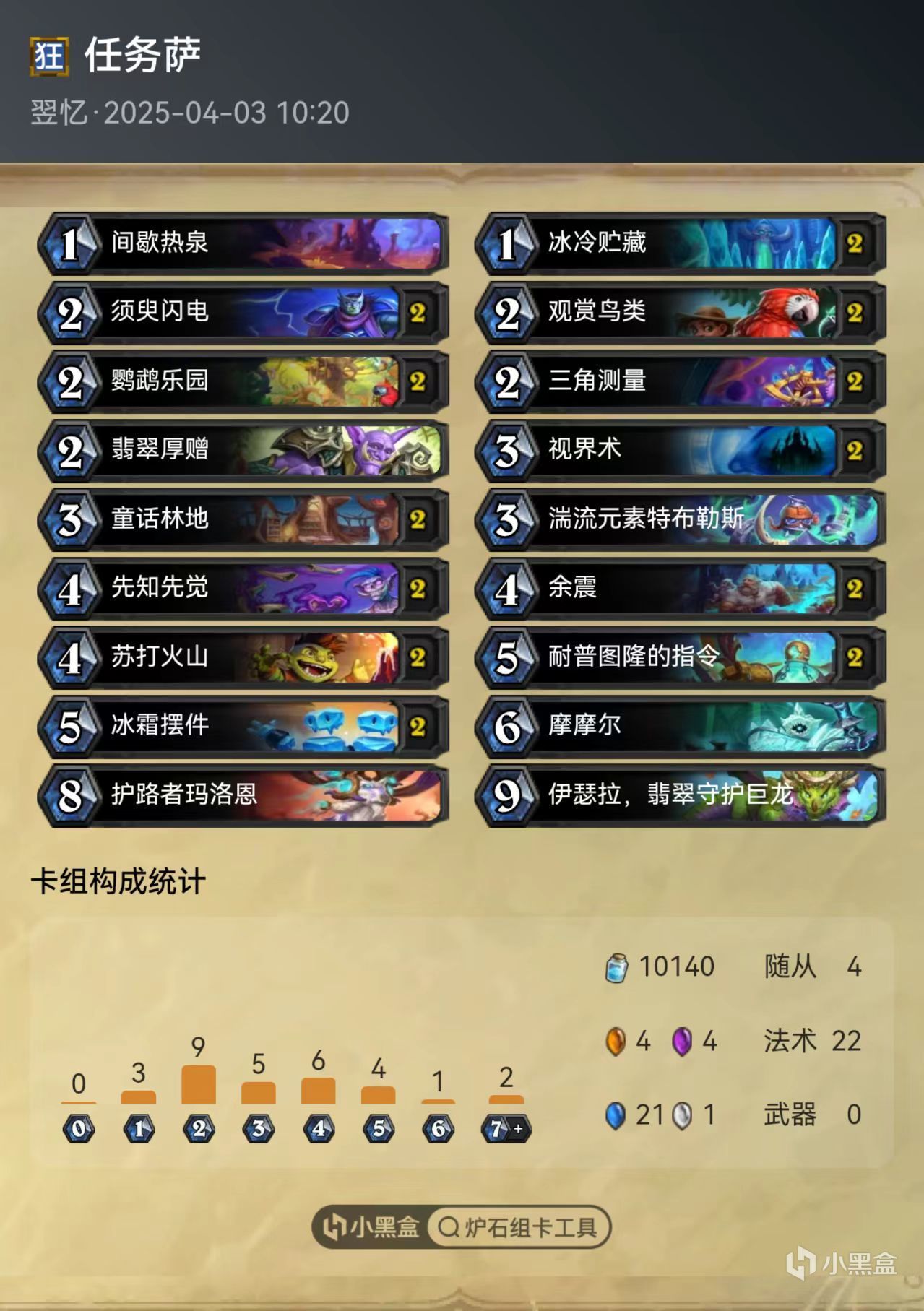 ### 任务萨 # 职业:萨满祭司 # 模式:狂野模式 # # 1x (1) 间歇热泉 # 2x (1) 冰冷贮藏 # 2x (2) 须臾闪电 # 2x (2) 观赏鸟类 # 2x (2) 鹦鹉乐园 # 2x (2) 三角测量 # 1x (2) 翡翠厚赠 # 2x (3) 视界术 # 2x (3) 童话林地 # 1x (3) 湍流元素特布勒斯 # 2x (4) 先知先觉 # 2x (4) 余震 # 2x (4) 苏打火山 # 2x (5) 耐普图隆的指令 # 2x (5) 冰霜摆件 # 1x (6) 摩摩尔 # 1x (8) 护路者玛洛恩 # 1x (9) 伊瑟拉,翡翠守护巨龙 # AAEBAc2+BQa8tgSt4Qah4gap9Qbp/AbygwcMxs4EhdQEhqEF6aMFyvgFn54Gp6UGpKcGw74GzsAG0MAG+OIGAAA= # 想要使用这副套牌,请先复制到剪贴板,然后在游戏中点击“新套牌”进行粘贴。 # 分享自小黑盒炉石传说卡组推荐工具