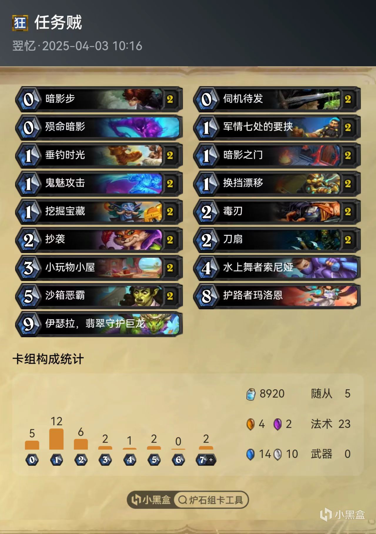 ### 任务贼 # 职业:潜行者 # 模式:狂野模式 # # 2x (0) 暗影步 # 2x (0) 伺机待发 # 1x (0) 殒命暗影 # 2x (1) 军情七处的要挟 # 2x (1) 垂钓时光 # 2x (1) 暗影之门 # 2x (1) 鬼魅攻击 # 2x (1) 换挡漂移 # 2x (1) 挖掘宝藏 # 2x (2) 毒刃 # 2x (2) 抄袭 # 2x (2) 刀扇 # 2x (3) 小玩物小屋 # 1x (4) 水上舞者索尼娅 # 2x (5) 沙箱恶霸 # 1x (8) 护路者玛洛恩 # 1x (9) 伊瑟拉,翡翠守护巨龙 # AAEBAcKPBATMoAWKqAap9QbygwcNvQTl0wOh9AP2nwT3nwS3swT03QTBoQW/9wXZogatpwazqQbyyQYAAA== # 想要使用这副套牌,请先复制到剪贴板,然后在游戏中点击“新套牌”进行粘贴。 # 分享自小黑盒炉石传说卡组推荐工具