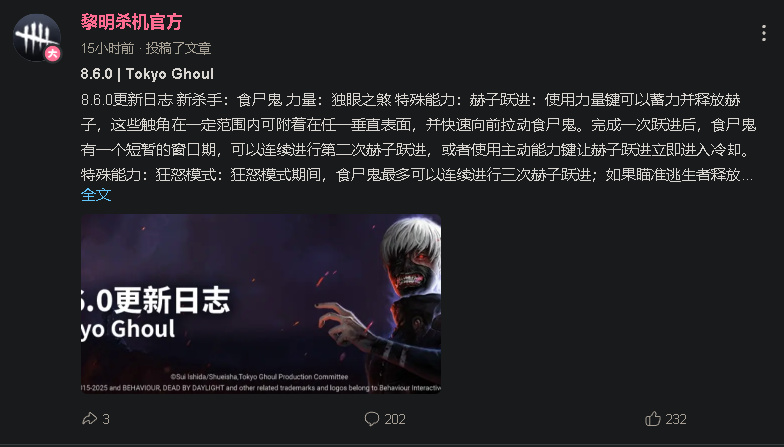 杀机喰种DLC已经正式上线,测试服的强度没活到正式服,强度已经下来了,随便聊聊DLC的一些信息: