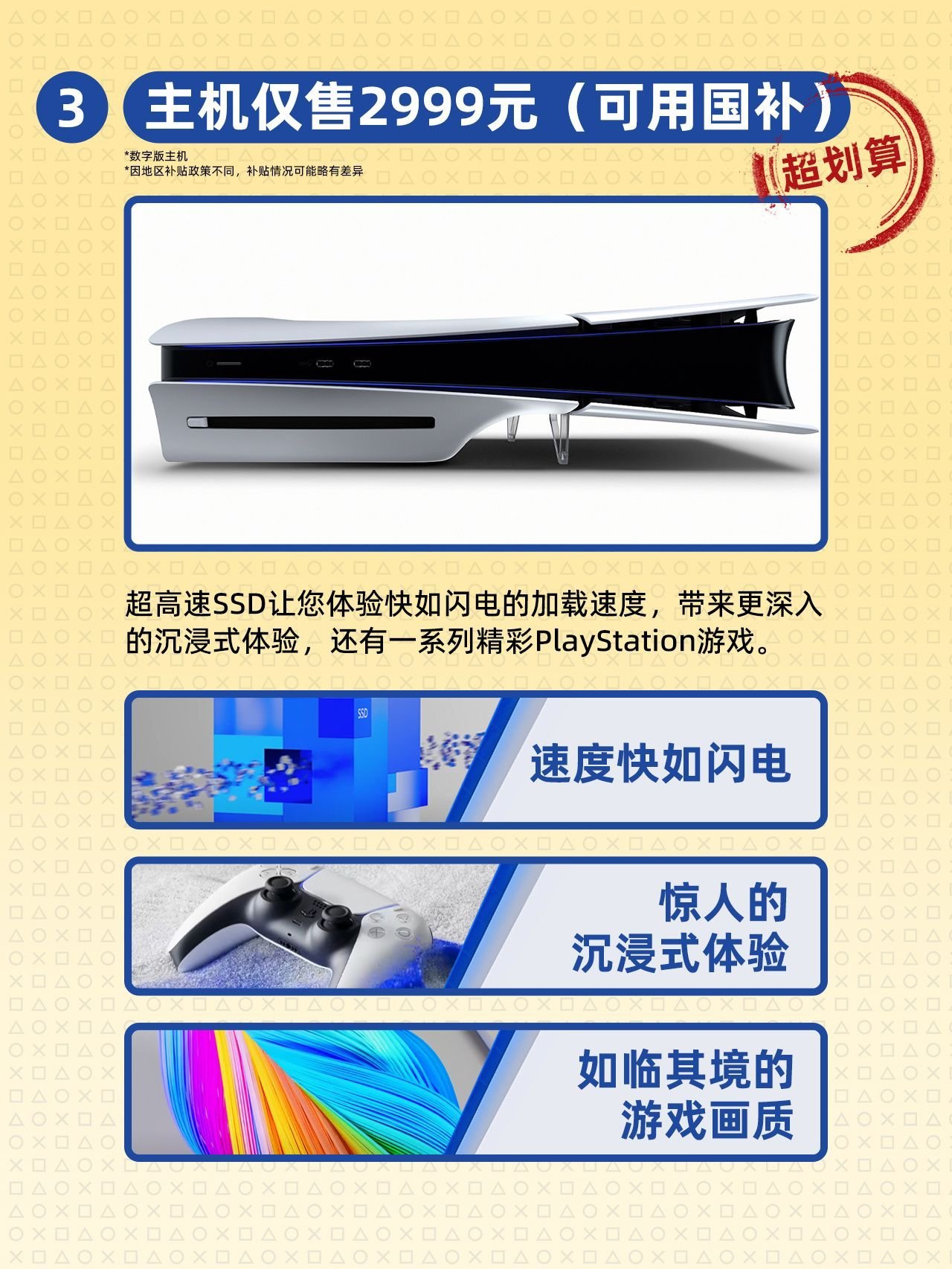 国行主机售价2999元起,支持“国补”政策,对比其他版本,PS5 Pro行情价为4798元,但标准版PS5价格更稳定,适合主流玩家需求。