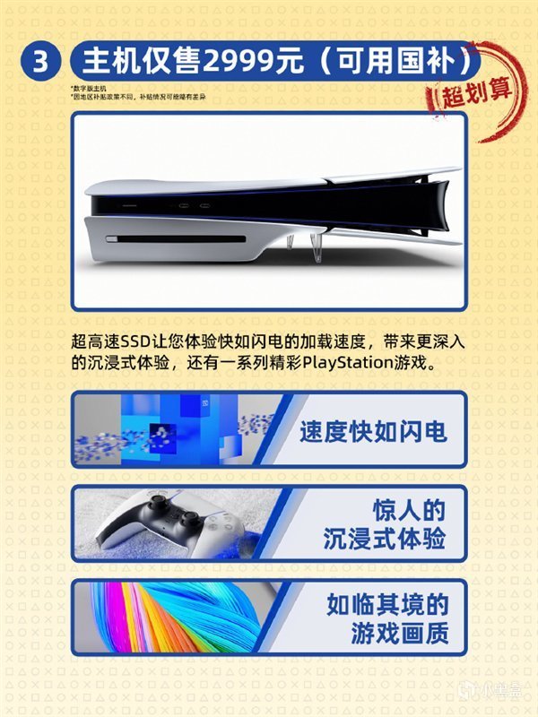 圖片中,還提到了PS5主機僅售2999元,可用國補,實體版遊戲不加價等內容。