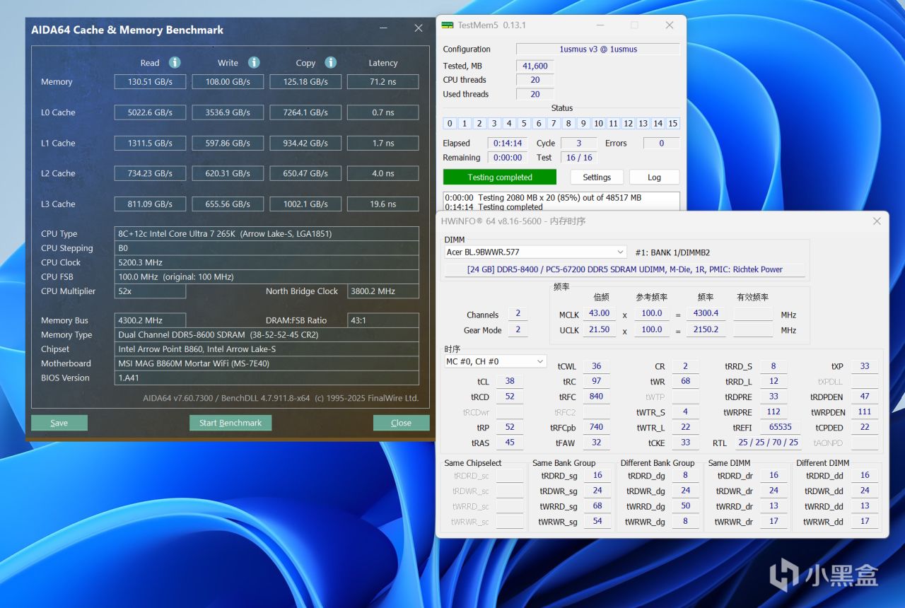 265K搭配DDR5 8600C38-52-52-45 24GB*2(換M-Die條子,Gear 2模式,優化小參,NGU和D2D頻率默認),延遲僅供參考無需對比,確保性能發揮無異常先通過TestMem 5@1usmus v3十分鐘左右3輪烤機驗證