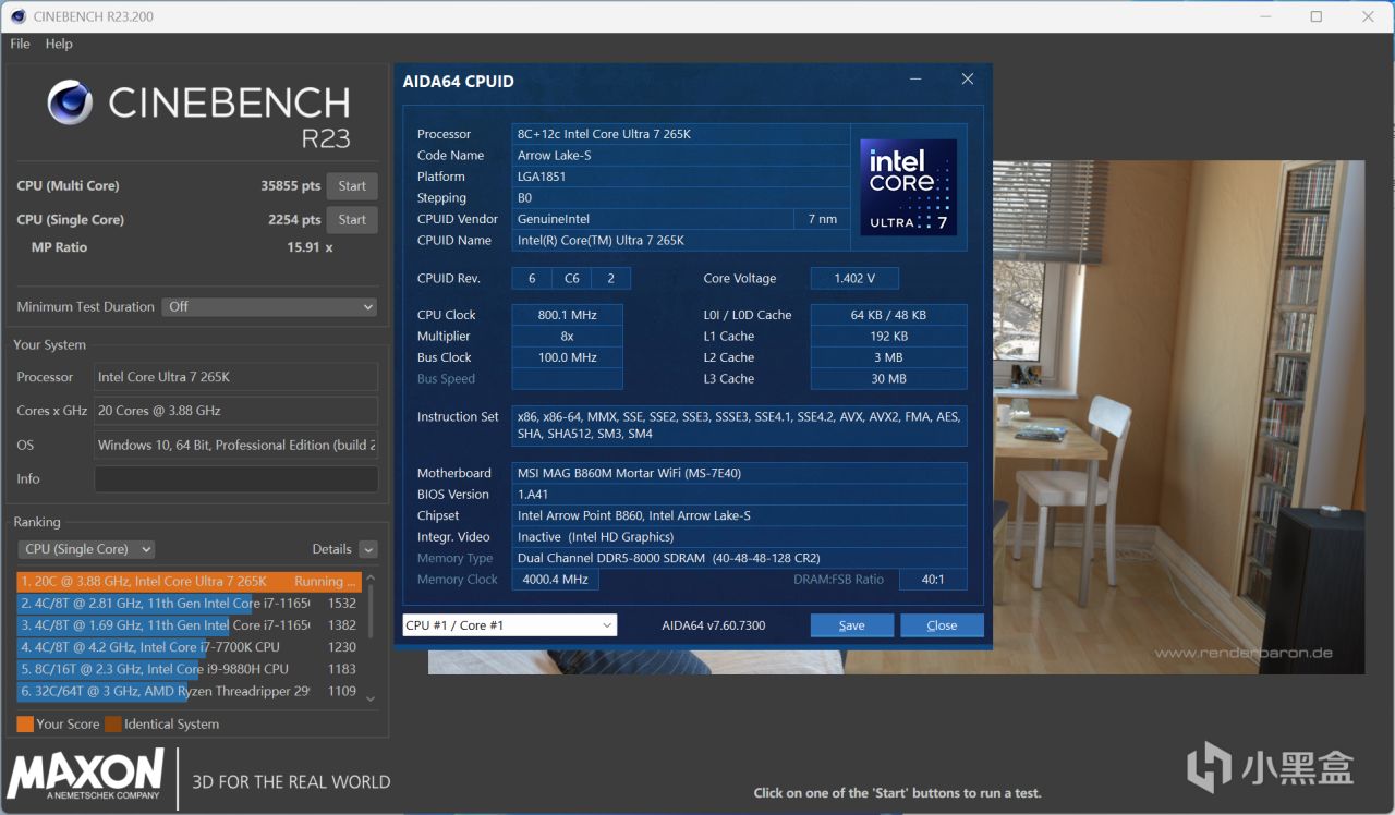 CINBENCH R23,265K單核得分2254 pts,多核得分35855 pts,內存幾乎不受影響