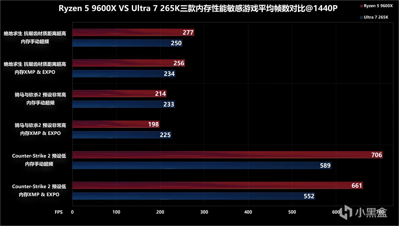 而對比上方圖表差距可以看到,在電競網遊裏頭,265K即便大幅度超頻內存,難以擊敗9600X尤其是Counter-Strike 2不痛不癢,而絕地求生超完仍和默認的9600X有2%差距。至於騎馬與砍殺2,9600X表示已經盡力,瓶頸還是在於6核心,上面已經說過這點是無可厚非的。