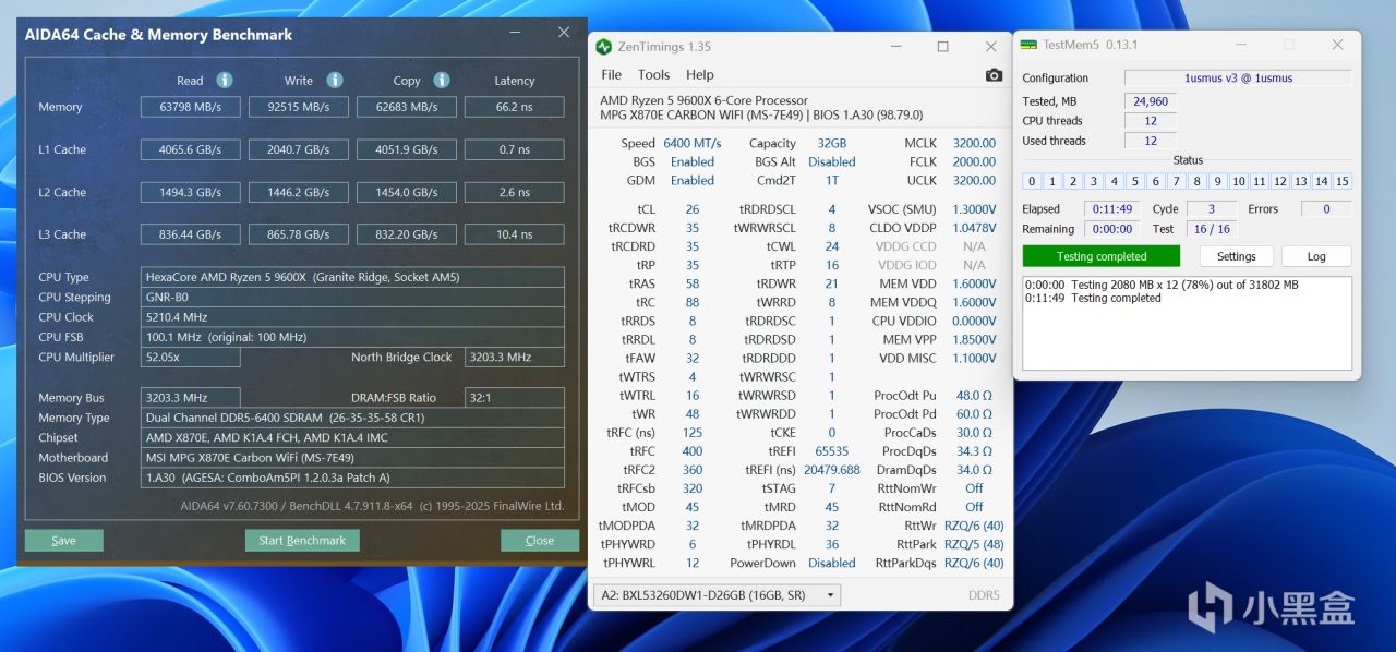 9600X搭配DDR5 6400C26-35-35-58 16GB*2(同步UCLK=MEMCLK,優化小參,FCLK頻率默認),延遲僅供參考無需對比,確保性能發揮無異常先通過TestMem 5@1usmus v3十分鐘左右3輪烤機驗證