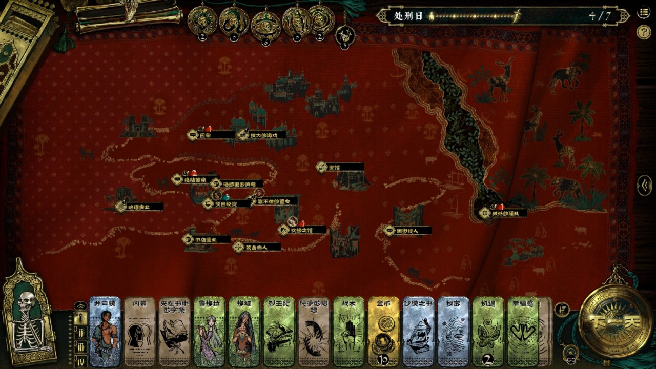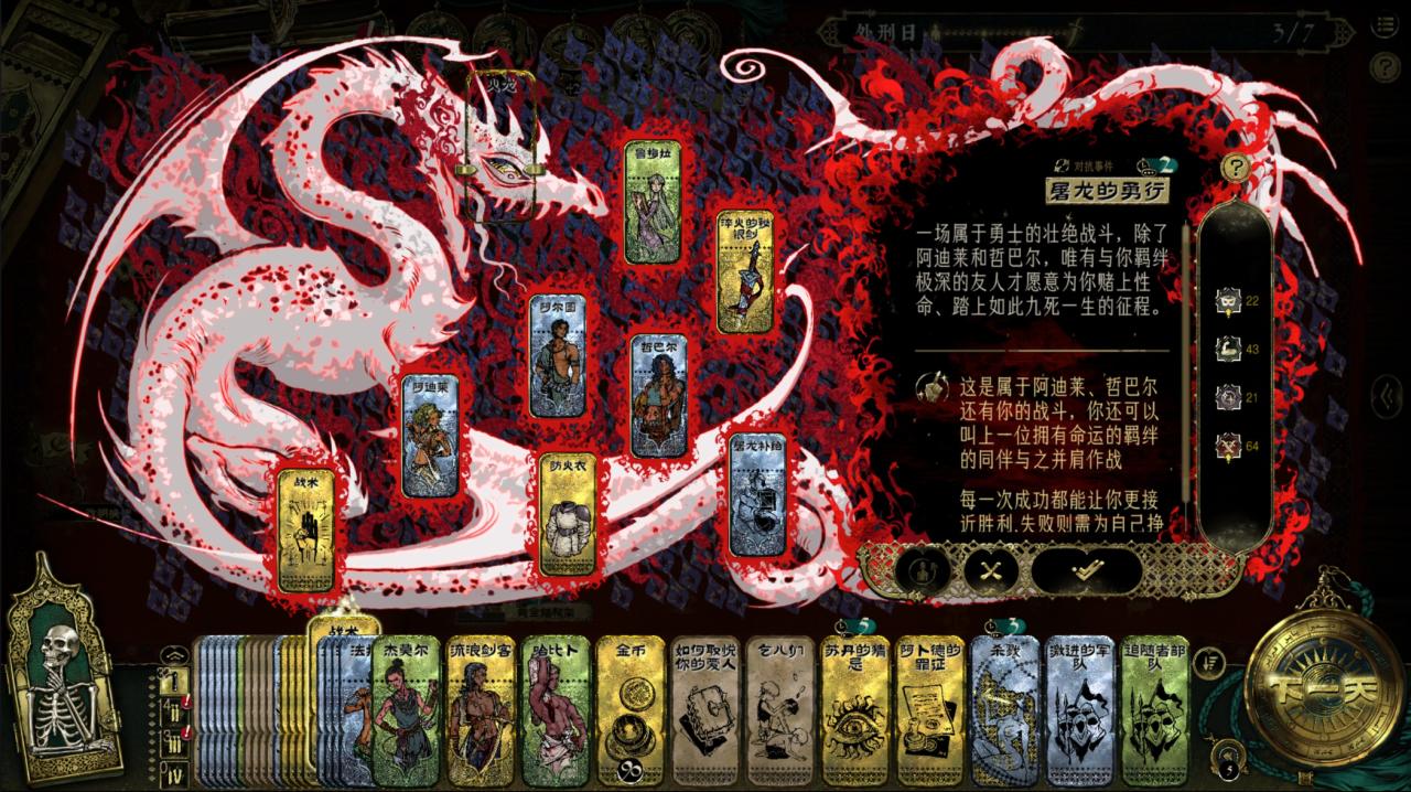 游戏界面分为事件栏和卡牌栏,面对事件,玩家需要合理安排人物或卡牌,从而获得资源、属性、或者折断苏丹牌。