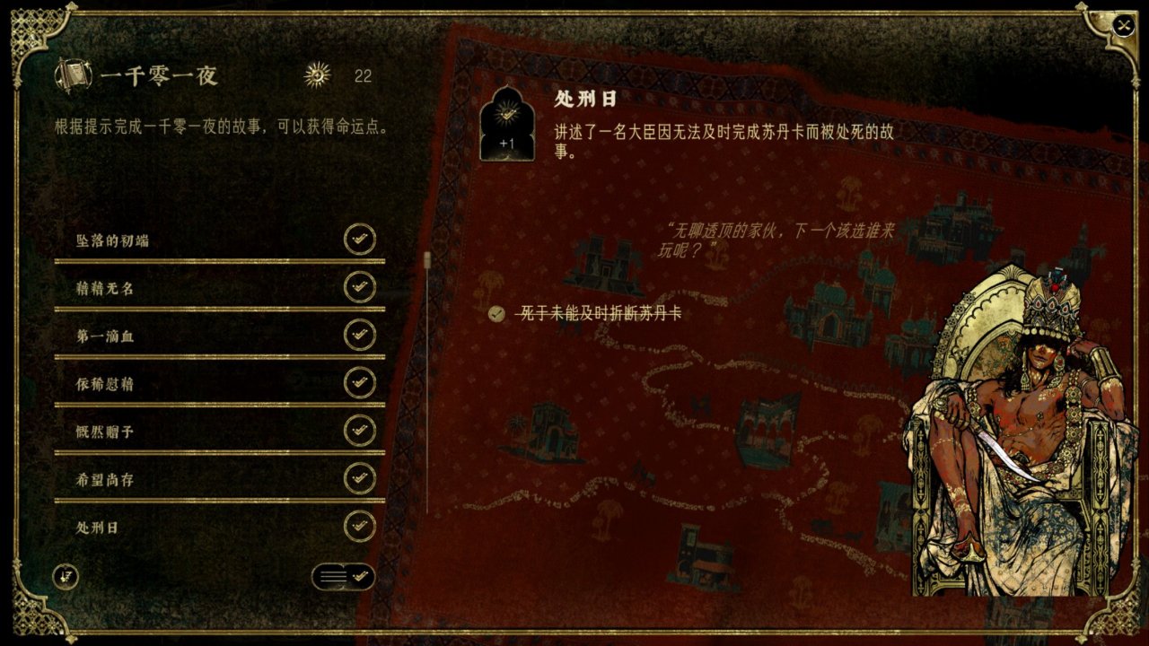 当你抽中杀戮磨刀霍霍时,可以到小院拔刀向妓女;也可以面对夫妻争斗时剑指一方;还可以在苏丹面前与大臣决斗;更可以将苏丹的宰相一举斩杀。