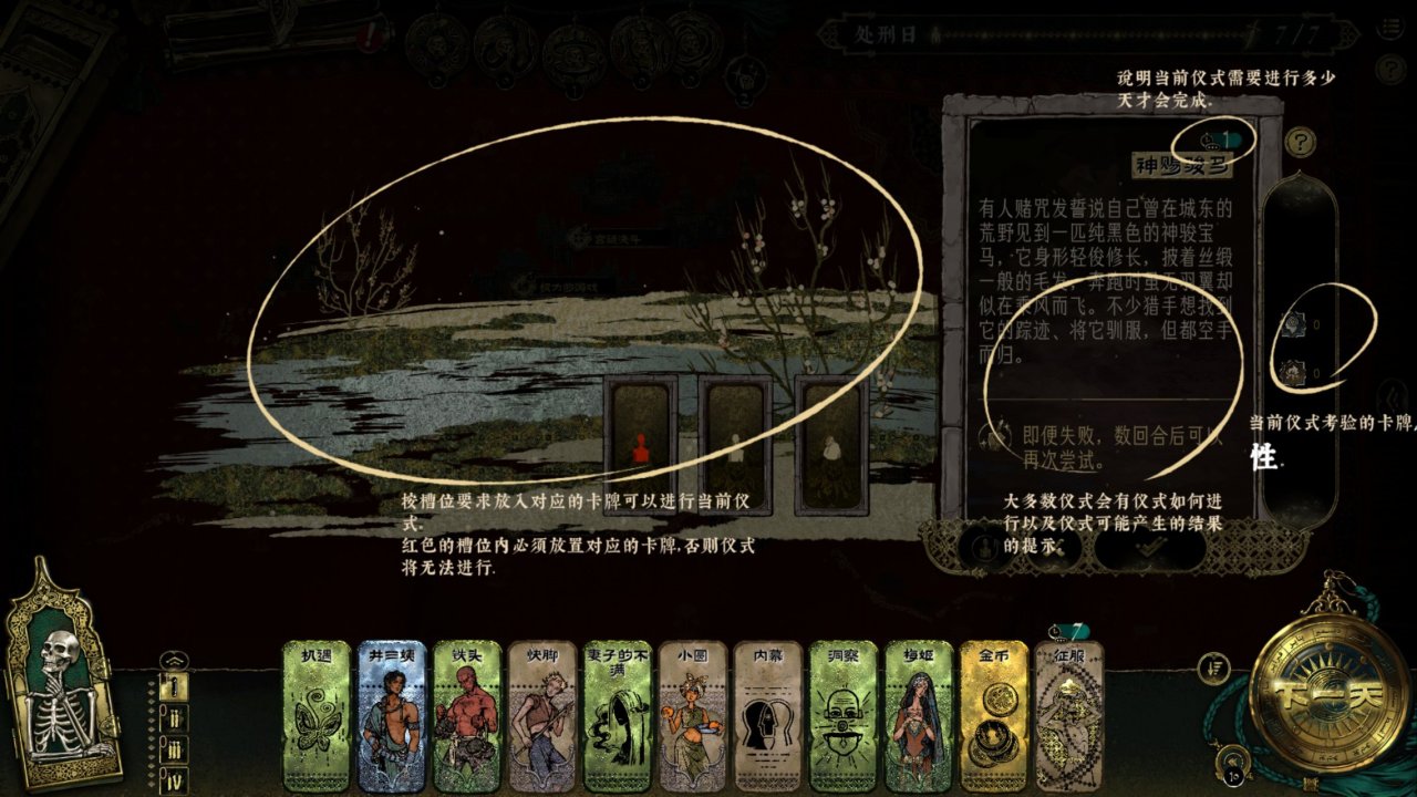 每当玩家将卡牌安排完毕,即可点击进入下一天,玩家安排的卡牌也会根据时间开始结算。