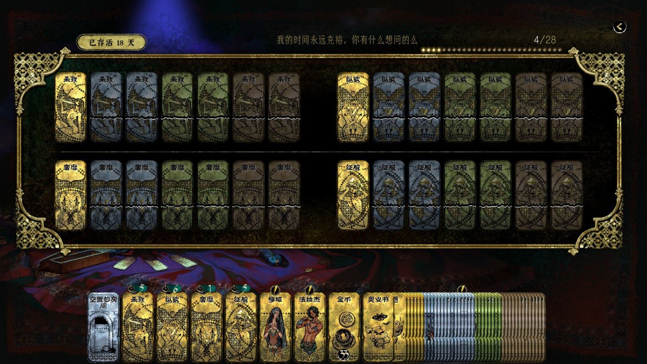 进入游戏中,选择了玩家出生与基础资源后,游戏便开始了。面对着四大卡牌,各式各样的事件等待着玩家。