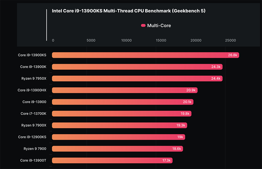 而 i9-13900T 的单核心跟 13900K 和 13900KS 的差距也没有说非常大,因此有在考虑第 13 代同系列的朋友,可能会觉得选 T 系列好像比较好,但其实还要再看多核心成绩。下图可以明显看到,i9-13900T 就落后 13900、13900K 和 13900KS 不少,意味着在多任务作业上感受会特别明显: