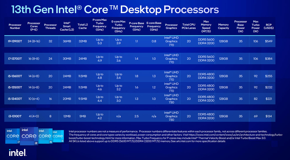 下图是 Intel 于 CES 2023 活动中发表的第 13 代 T 系列,共有 6 款,其中 i5 有 3 款选择,更详细介绍可以阅读我们之前的文章报导: